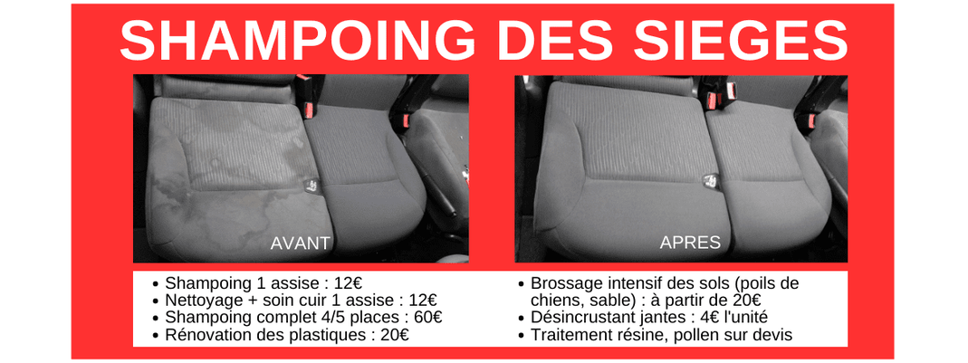 Shampoing des sièges - Rénovation plastique - Brossage intensif - Désincrustant jantes - Traitement résine pollen