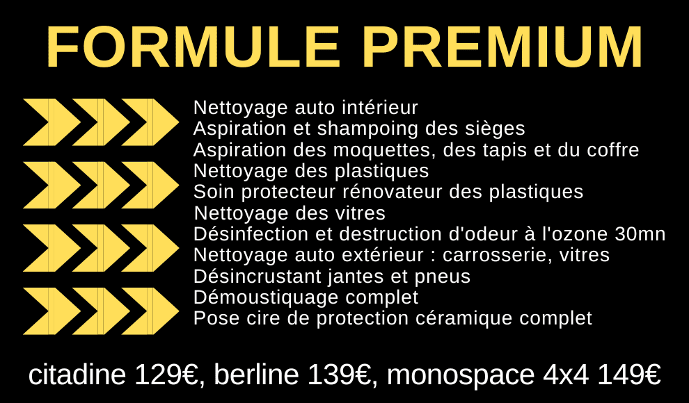 Shampoing des sièges - Rénovation plastique - Brossage intensif - Désincrustant jantes - Traitement résine pollen